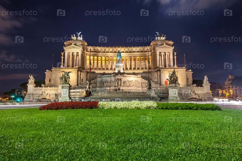 Памятник Витторио Эммануилу II на Венецианской площади в Риме ночью, Италия