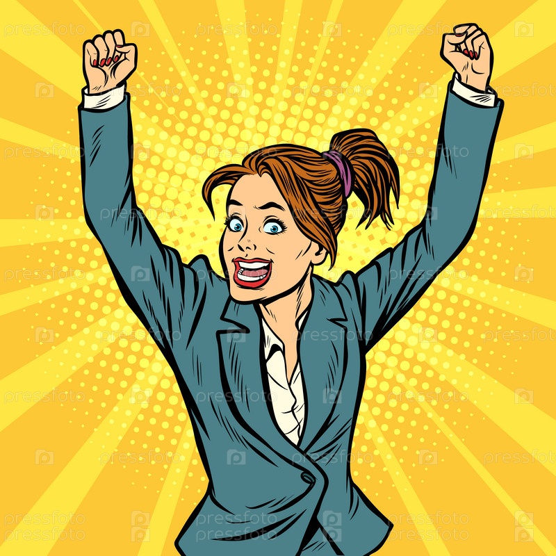 Веселая женщина, выигрывающая жестом руки вверх