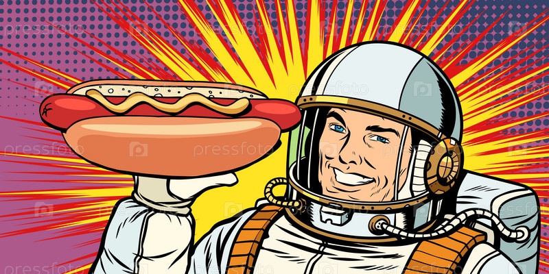 Улыбающийся астронавт-мужчина представляет сосиски для хотдогов