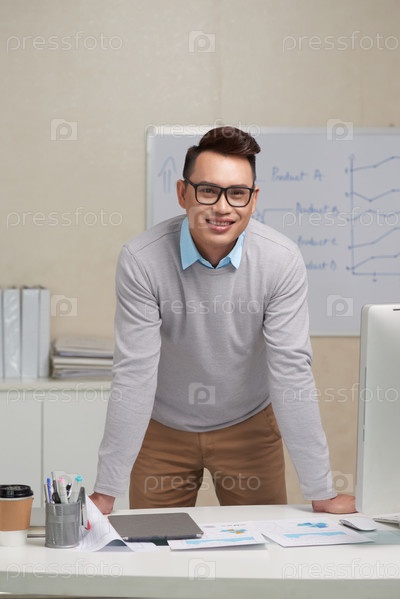 Веселый молодой азиатский бизнесмен, опирающийся на свой офисный стол