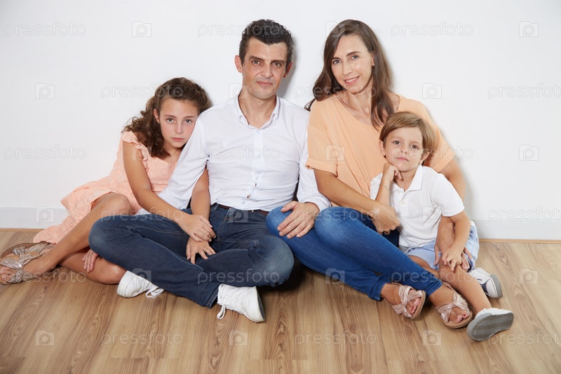 Родители и дети сидят на полу в своей квартире