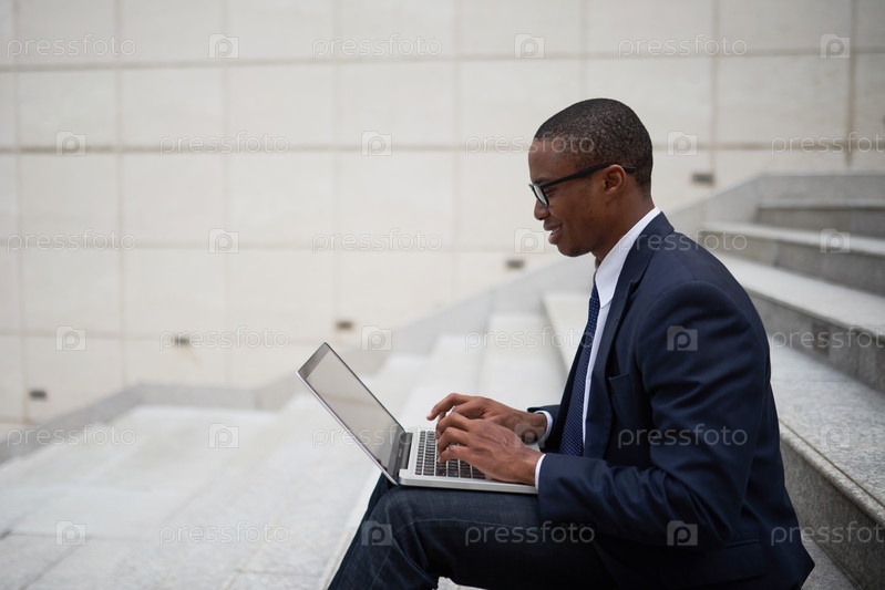 Улыбающийся бизнесмен отвечает на электронные письма