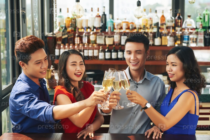 Молодые люди празднуют что-то в баре