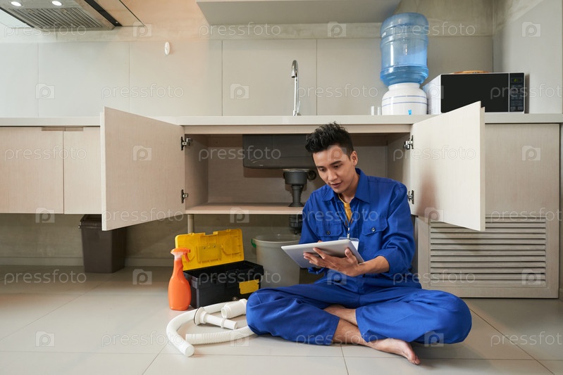 Сантехник проверяет планшетный компьютер