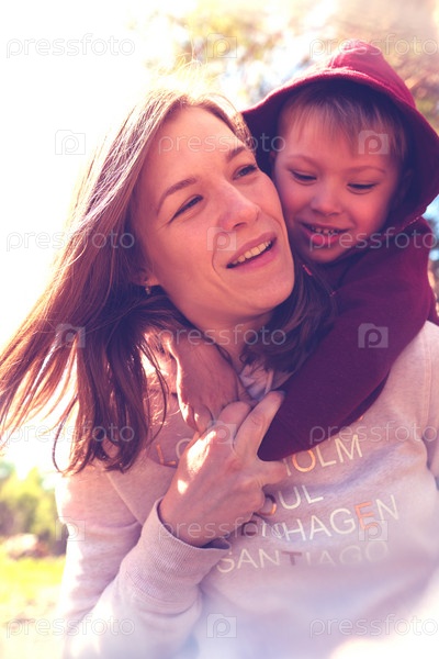 Улыбающаяся мать и ребенок играют вместе в парке