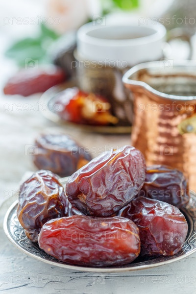 Вкусные финики на бронзовой тарелке и черный кофе