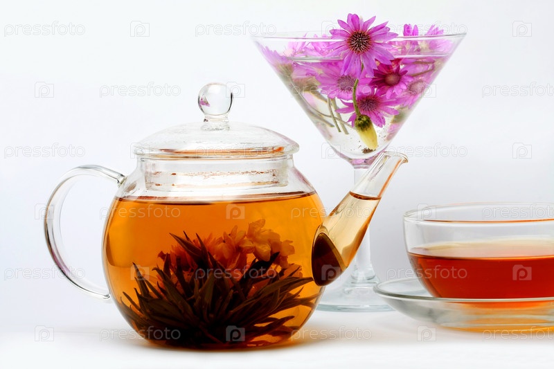 Заварочный чайник и цветы в бокале