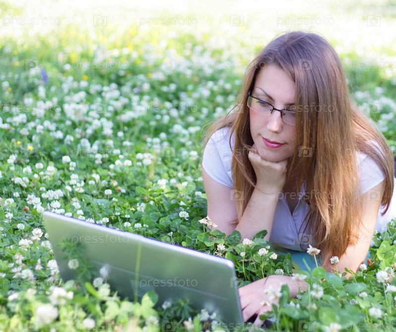 Девушка с ноутбуком на лугу