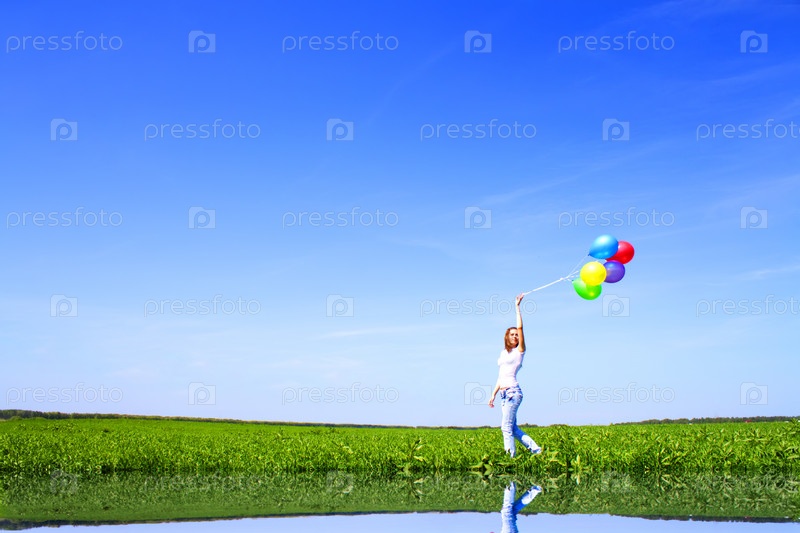 Девочка на берегу пруда с воздушными шарами