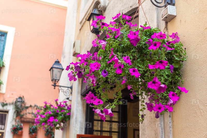 Горшок с розовыми цветущими растениями на типичной улице старого города