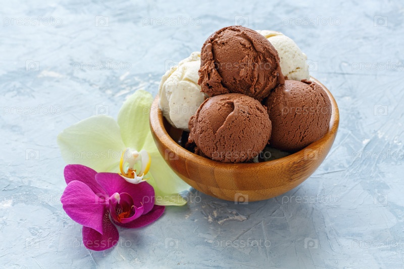 Ванильные и шоколадные шарики мороженого в деревянной таре