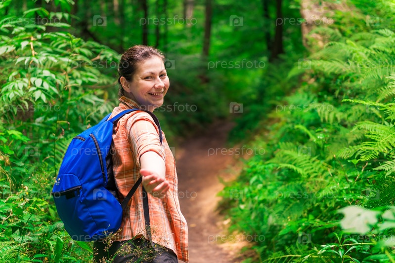 Брюнетка с рюкзаком протягивает руку в зеленом лесу во время похода