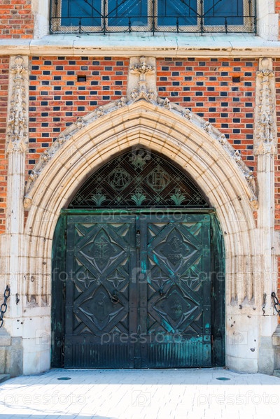 Массивные металлические ворота вход к кирпичной католической церкви