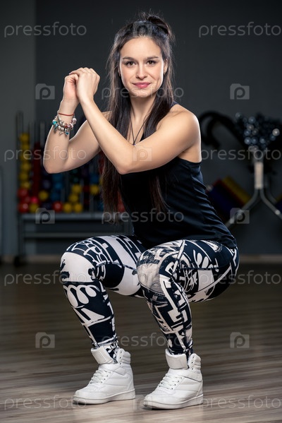 Красивая молодая девушка в тренажерном зале делает упражнения на приседаниях