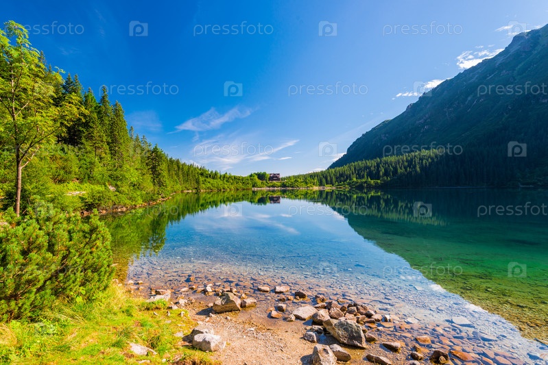 Озеро Морское-Око, окруженное лесами в Татрских горах, Польша