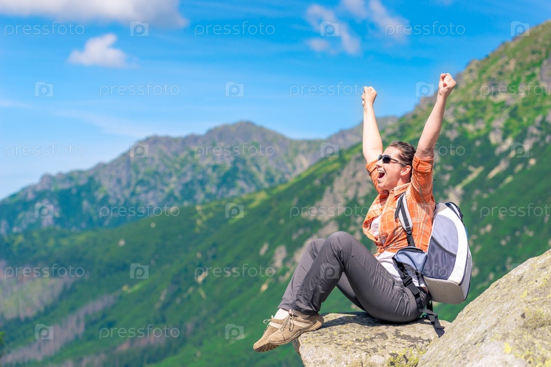 Успешный турист, который сидит на горе и наслаждается свободой