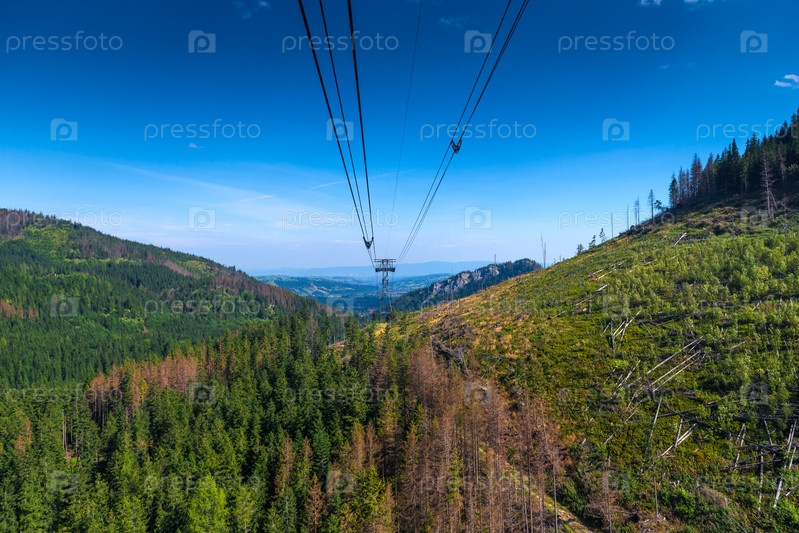 Зеленые холмы и канатная дорога в солнечный летний день, Польша Zakopane