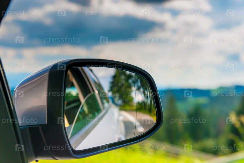 Автозеркало с отражением красивого пейзажа в нем, крупный план