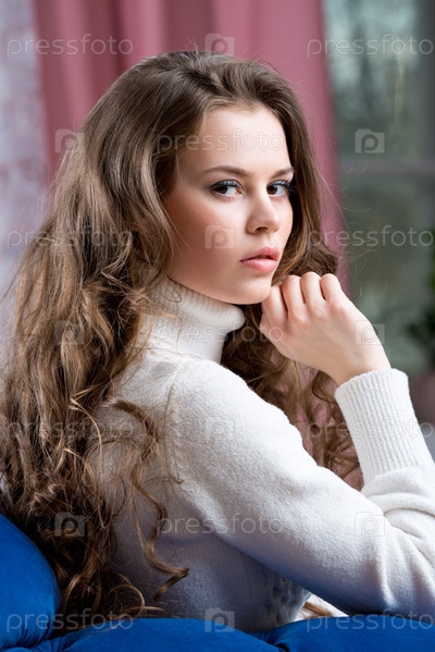 Вертикальный портрет очаровательной женщины в белом вязанном свитере
