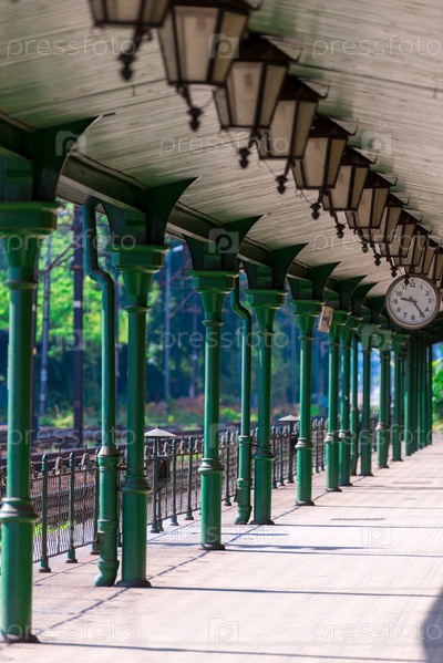 Пустая платформа станции в ретро-стиле с круглыми часами