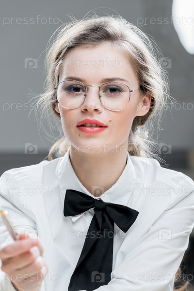 Красивая молодая и успешная бизнесвумен с очками, крупный портрет