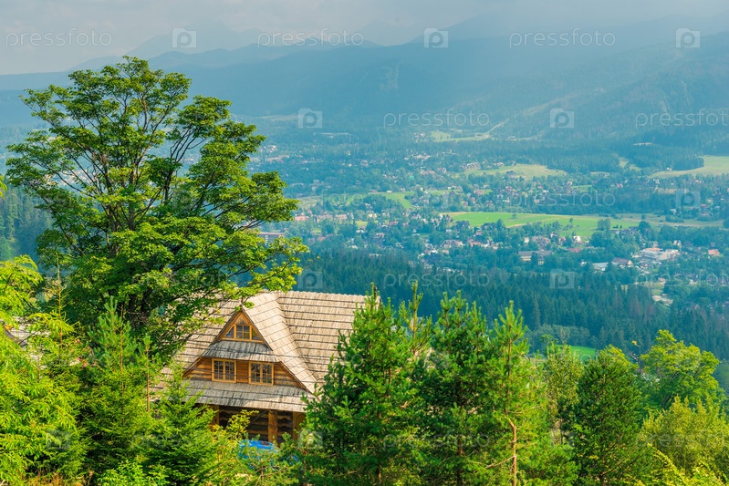 Стрельба с высоты - деревня в долине у подножия горы в Закопане, Польша