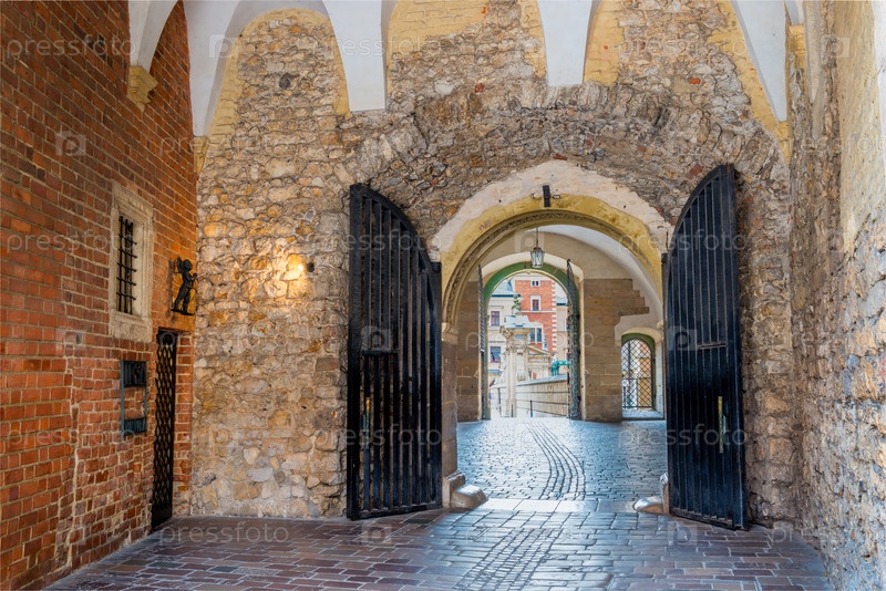 Красивая каменная арка замка и каменный тротуар Средневековья