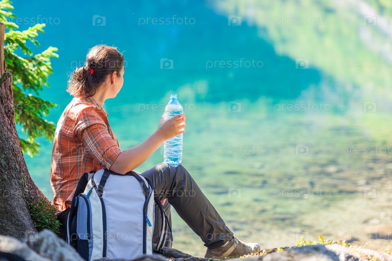 Девушка-туристка с бутылкой воды, восхищающаяся красивым горным озером в Татрах