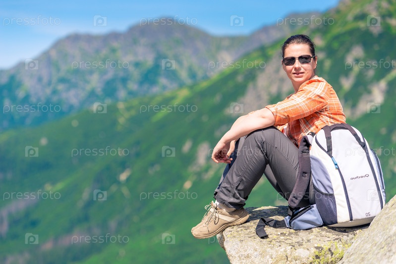 Активный турист сидит на скале в горах с рюкзаком, отдыхает с видом на горы