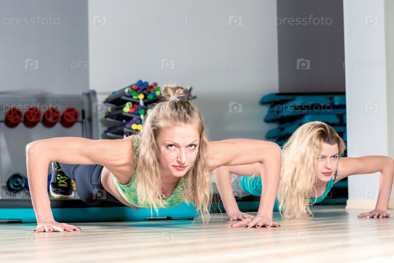 Упражнения отжимания, портрет красивой девушки в спортзале во время тренировки