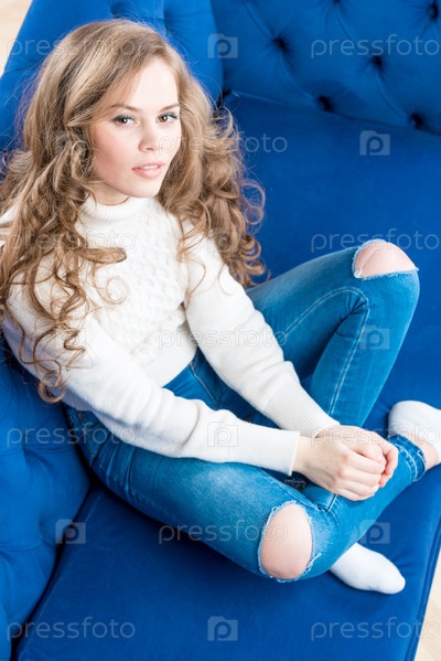 Вид сверху красивой девушки в теплом свитере на диване в гостиной