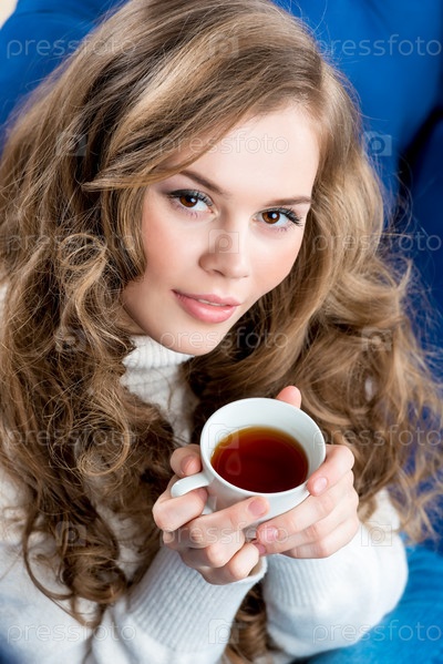 Близкий портрет красивой девушки с чашкой чая на диване
