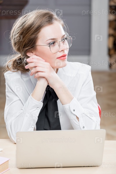 Мечтательная бизнесвумен с очками у компьютера