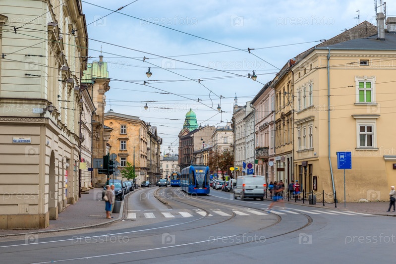 Улица города Кракова, трамвай общественного транспорта в городе