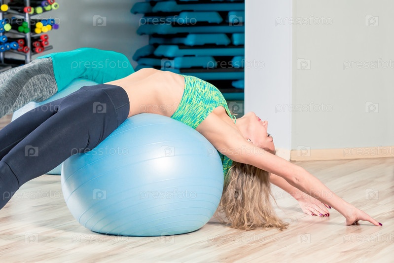 стройная женщина растягивает мышцы, занятия в группе с гимнастическими мячами в тренажерном зале
