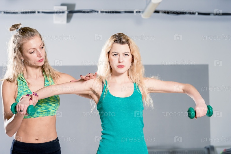 Персональный тренер помогает женщине правильно держать спину во время упражнений с гантеликами