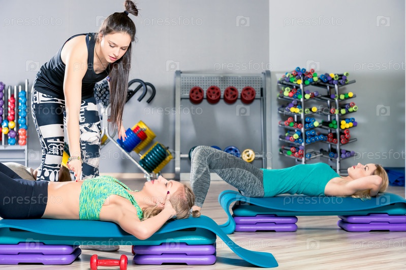 Опытный тренер помогает правильно выполнять упражнения для женщин в тренажерном зале