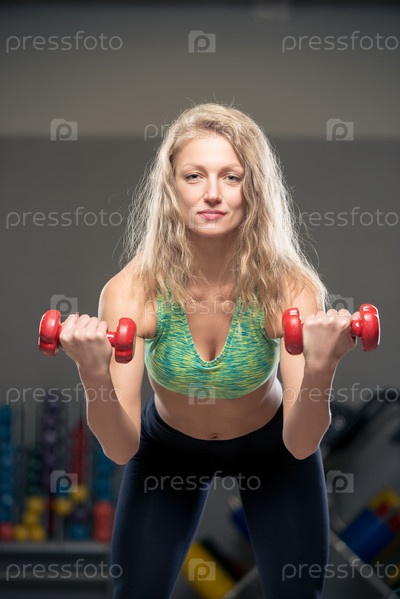 Красивая блондинка, выполняющая упражнения с гантеликами в тренажерном зале