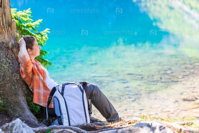 Расслабляющийся путешественник с рюкзаком сидит у Sea Eye в Татрских горах и восхищается