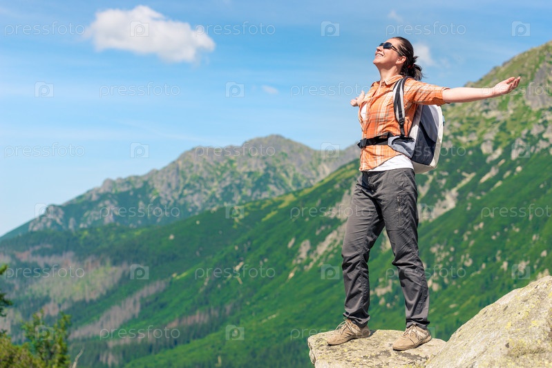 Портрет счастливой женщины, покоряющей высокую гору с рюкзаком и наслаждающейся свободой