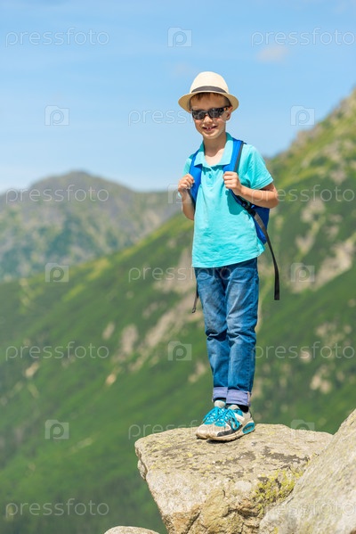 Вертикальный портрет молодого путешественника с рюкзаком высоко в горах на скале