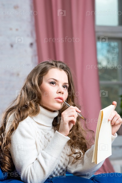 Портрет красивой внимательной девушки в теплом свитере на диване