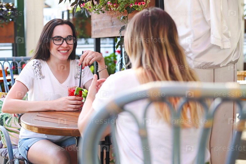 Две красивые женщины в открытом кафе