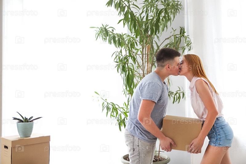 Молодая счастливая пара в комнате с коробками для переездов