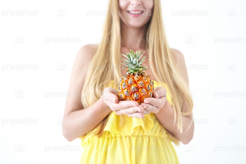 Красивая молодая женщина в желтом платье и соломенной шляпе, держащая свежий ананас
