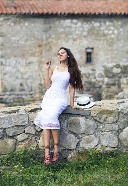 Стильная брюнетка в белом платье на фоне кирпичной стены