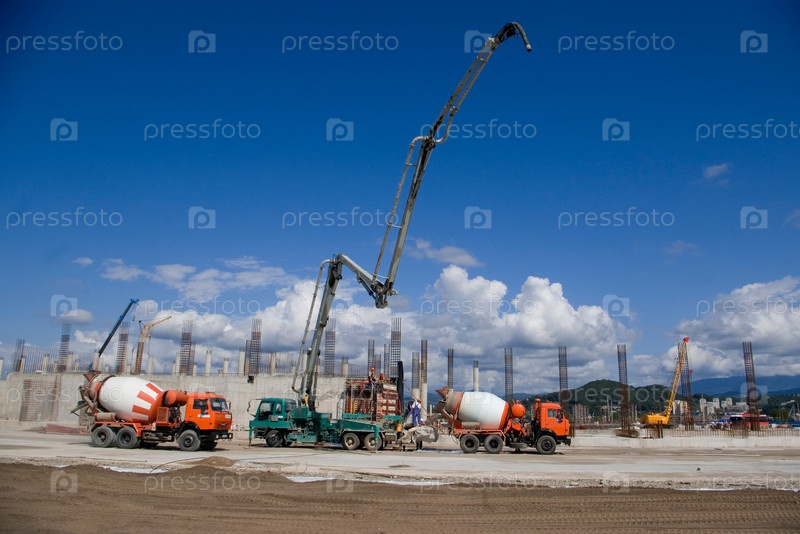 Строительная площадка с грузовиками и подъемным краном