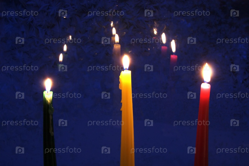 Горящие свечи на фоне морозного узора на стекле