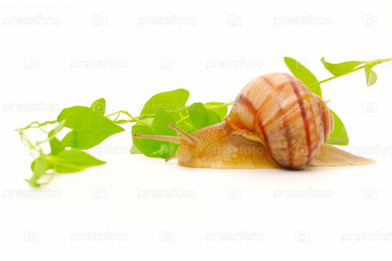 Улитка и листья винограда на белом фоне