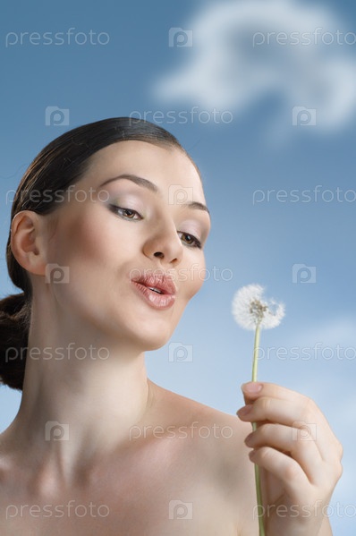 Девушка дует на одуванчик